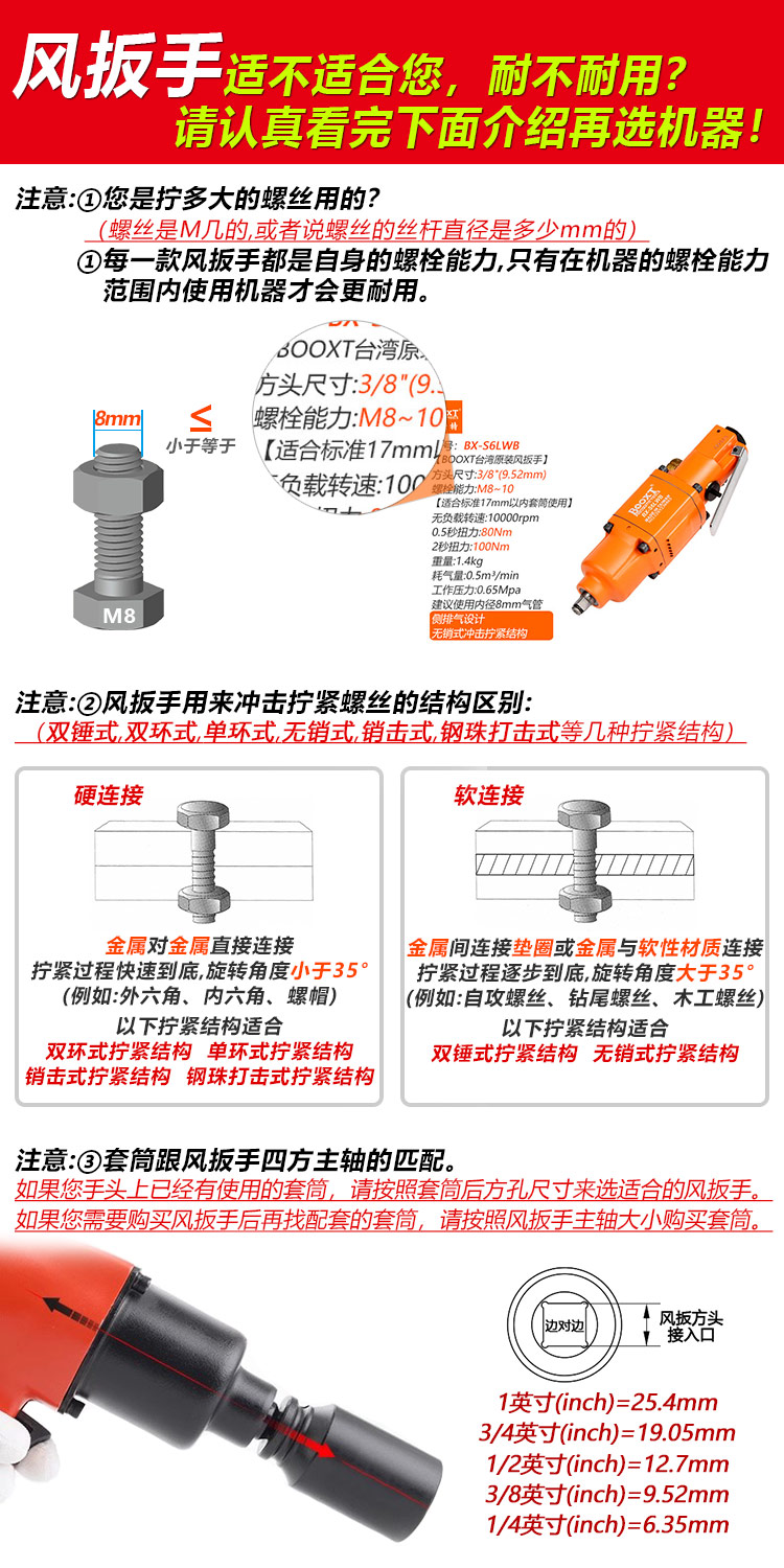 提示:因為不同制造工廠的測試標準不一樣,所測的扭力參數會相差比較大,另外測試扭力并不是實際螺栓擰緊的扭力(經常有客人用這個扭力參數來選型是錯誤的),建議沖擊式的工具選型請按“螺栓能力”來選,才是專業的。