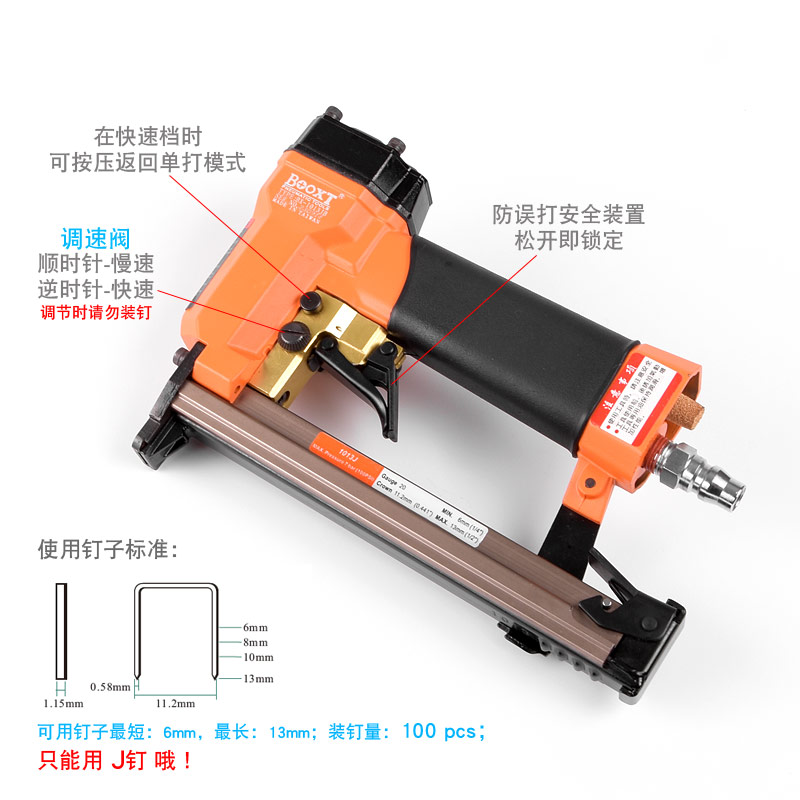 • 產品參數: 特點:可調節快速連打,自帶防誤打安全開關;釘子寬度:11.2mm;釘子跨度:10mm;釘腳尺寸:0.58×1.15mm;使用釘子長度范圍:6-13mm;裝釘量:100個;使用工作氣壓:0.6Mpa;推薦使用內徑6.5mm氣管;平時多注意定時排放空壓機水份